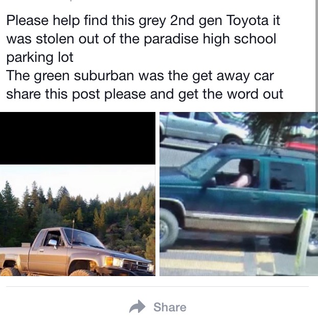 Playing the waiting game while searching the woods and checking social media proved painful for Bryson. All he could think about was his homebuilt Phyllis laying eviscerated in a chop shop. “Kids at school told me how they’d heard of this before in Paradise and that the person never saw their truck again. Same type of truck. Same crime,” he said ,”The office told me it was the first vehicle stolen in from the school in seven years though, so I don’t know.”