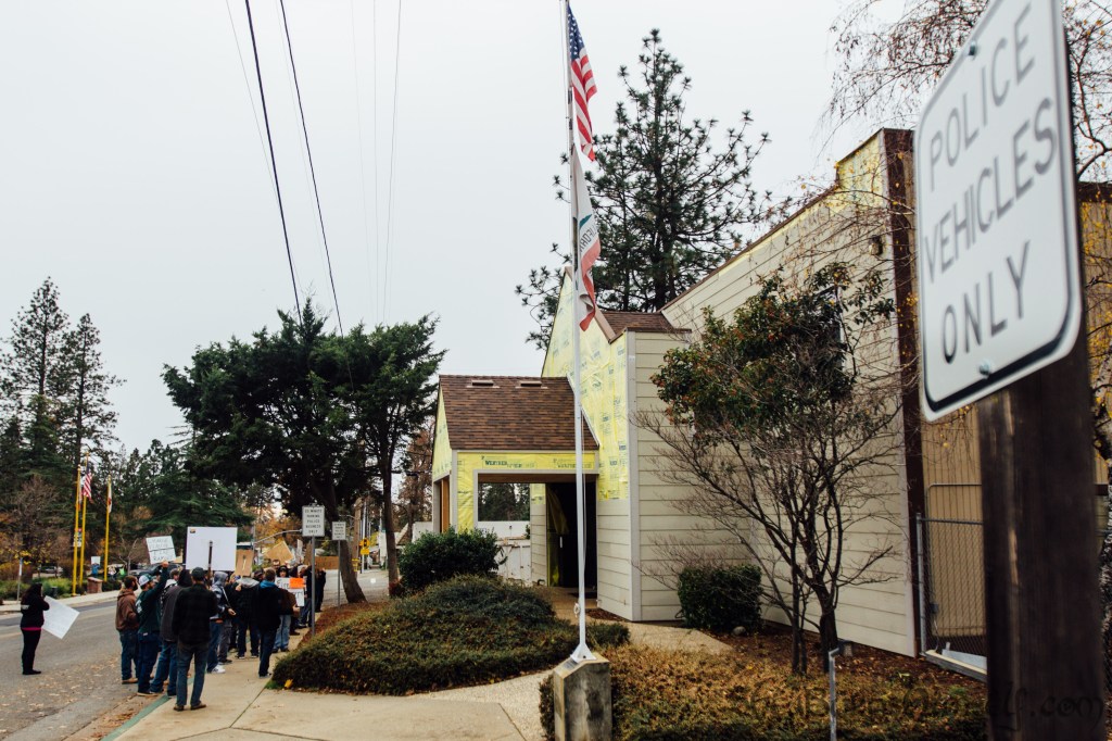 Within view of a flower memorial that stands where a life was lost, over 100 community members lined the corner of Pearson and Black Olive Drive in Paradise, California Saturday afternoon. They were there to express anger against the ruling of Butte County District Attorney, Mike Ramsey, on a police shooting that occurred just before Thanksgiving this year.