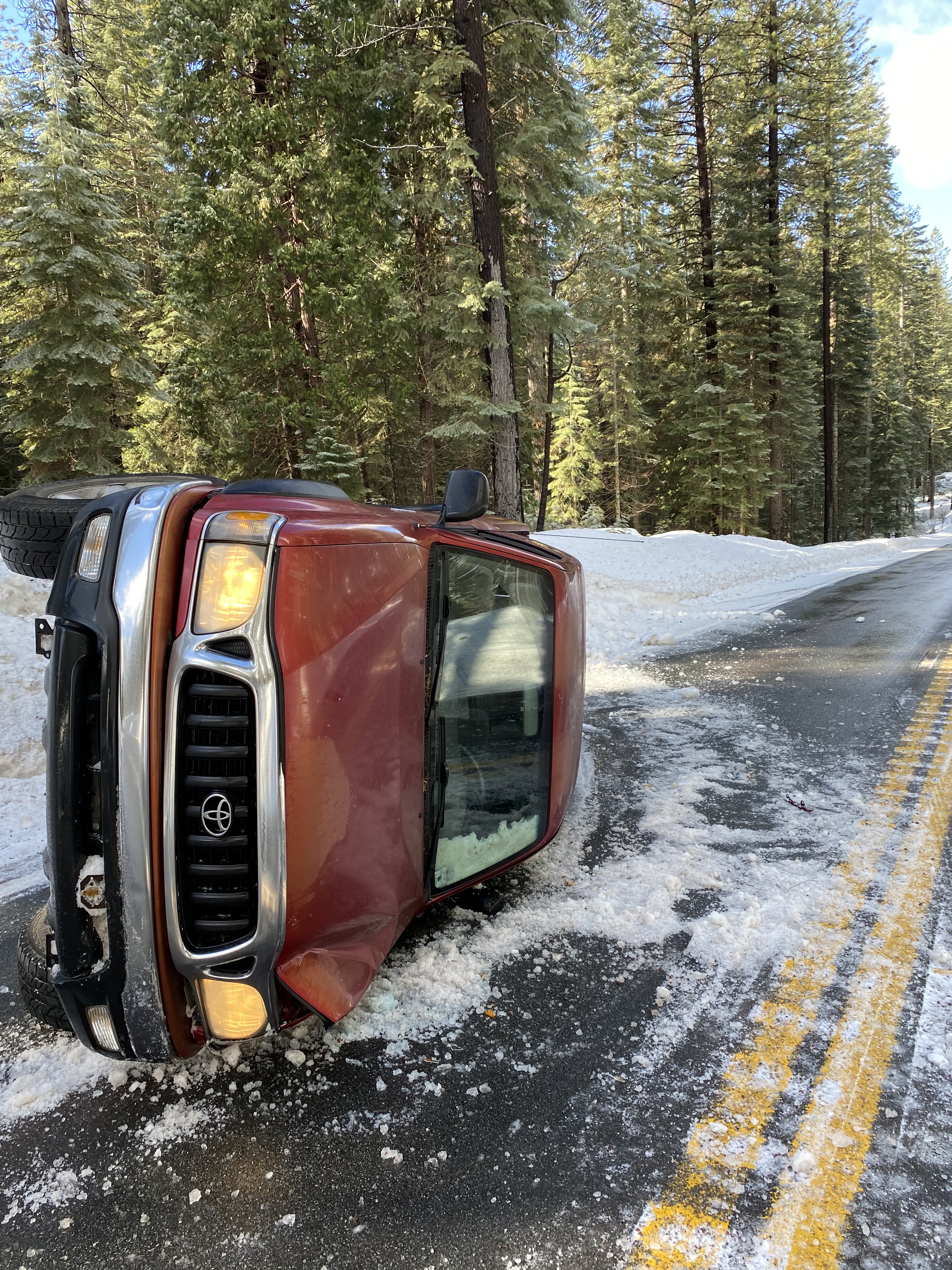 The tow truck took me and the damaged Toyota back to a yard in Weed. I watched my side mirror flap in the alpine air and thought about how beautiful that truck once was. I thought about how I hoped the tow truck driver didn’t have COVID. Rollover with a side of Rona. I realized that I really needed to pee and when we got to another patch of service my phone dinged. It was an email letting me know that my replacement door handle would be arriving in Susanville soon. Great. Maybe they could send a mirror, a hood, and a door too.